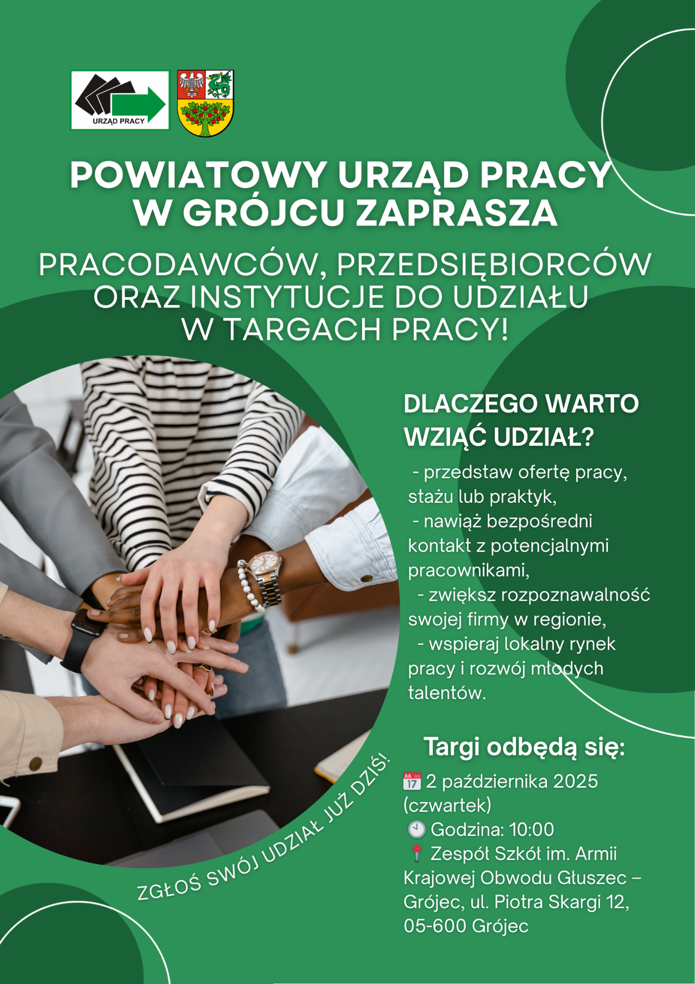 Powiatowy Urząd Pracy w Grójcu zaprasza na Grójeckie Targi Pracy, które odbędą się 2 października 2025 r. w Zespole Szkół im. Armii Krajowej Obwodu „Głuszec” w Grójcu (ul. Piotra Skargi 12).