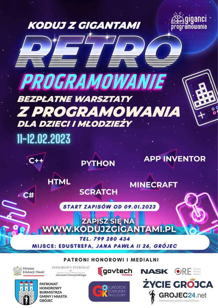 W Grójcu zawiata największe programistyczne wydarzenie dla dzieci i młodzieży. Już w lutym odbędzie się kolejna edycja “Koduj z Gigantami”, czyli bezpłatnej akcji edukacyjnej, która obejmie całą Polskę! W trakcie warsztatów uczestnicy nauczą się podstaw programowania, a przy tym poznają gry z czasów młodości swoich rodziców. Wydarzenie wspierają MEN, GovTech, Janusz Cieszyński Sekretarz Stanu w KPRM ds. Cyfryzacji, NASK i ORE oraz liczni włodarze miast, w których odbędą się zajęcia.