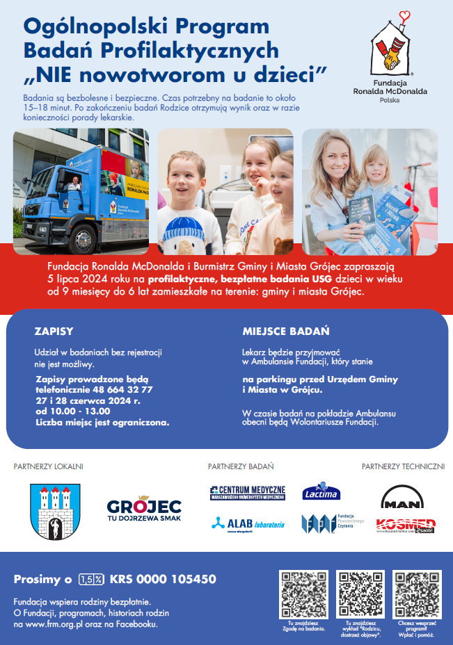 Fundacja Ronalda McDonalda i Burmistrz Gminy i Miasta Grójec, zapraszają na profilaktyczne badania USG dzieci w wieku od 9 miesięcy do 6 lat, zamieszkałe na terenie gminy Grójec. Badania odbędą się 5 lipca przed Urzędem Gminy i Miasta w Grójcu. Program badań Fundacji Ronalda McDonalda jest bezpłatny.