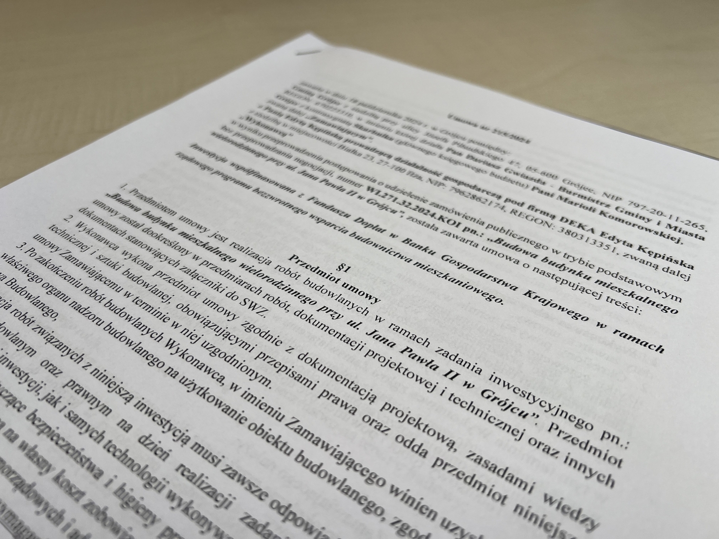 Burmistrz Gminy i Miasta Grójec podpisał dziś umowę na budowę nowego budynku komunalnego przy ul. Jana Pawła II. Prace ruszają już niebawem, a wykonawcą projektu będzie firma DEKA Edyta Kępińska z siedzibą w Białce. Koszt realizacji wyniesie 5 866 639,97 zł brutto, przy czym projekt otrzymał 85% dofinansowania w ramach rządowego programu wsparcia budownictwa.