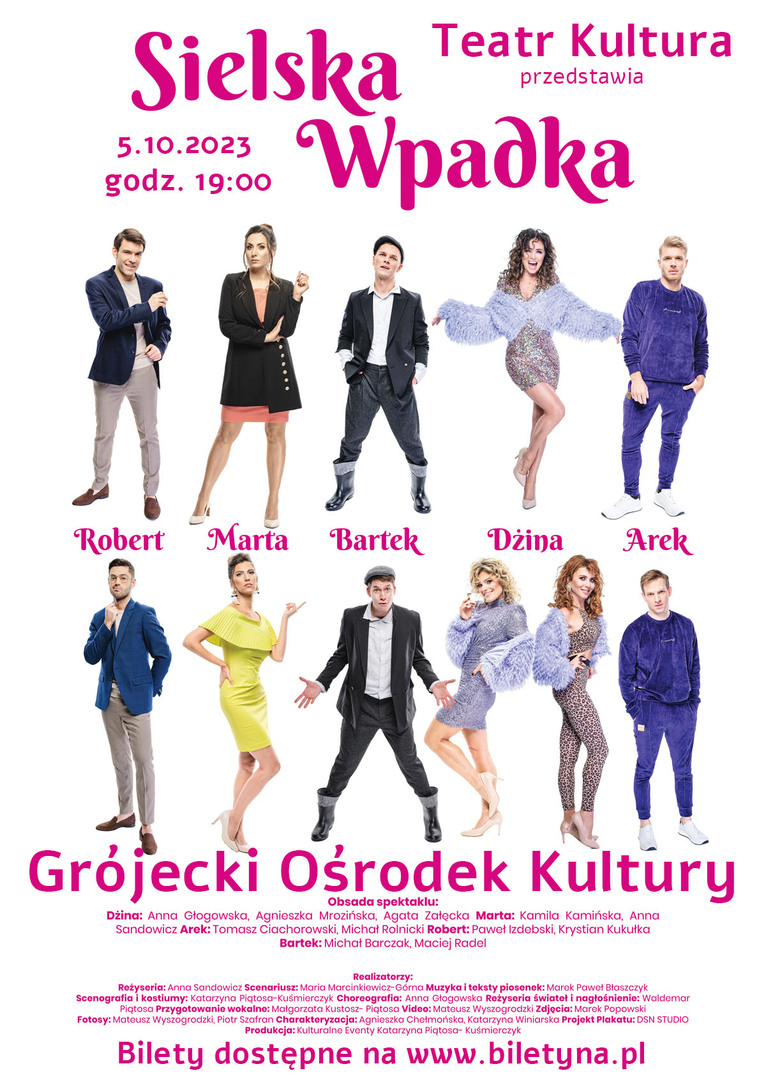 "Sielska wpadka" - Jeden weekend, dwie pary i wesele przyjaciela w tle. … Jak potoczy się to spotkanie? Bohaterowie przyjeżdżają na ślub i wesele do wiejskiego pensjonatu CountryLux na Podlasiu. Panowie nie widzieli się od dwudziestu lat i na to męskie spotkanie po latach cieszą się najbardziej. Czy ich żony podzielają ten entuzjazm? Na miejscu nic nie jest takie, jak być powinno… Czeka ich niejedna niespodzianka i ktoś jeszcze…Sielska atmosfera, zwroty akcji i miłosny twist mocno zaskoczą bohaterów. Tego się nie spodziewali… Spektakl “Sielska Wpadka” to romantyczna komedia omyłek; barwne postaci, zabawne zmiany biegu wydarzeń, sekretny romans i wiejski klimat… Towarzyszyć temu będą charyzmatyczne piosenki i muzyka na żywo. Aż chciałoby się zatańczyć… Ze śmiechu!