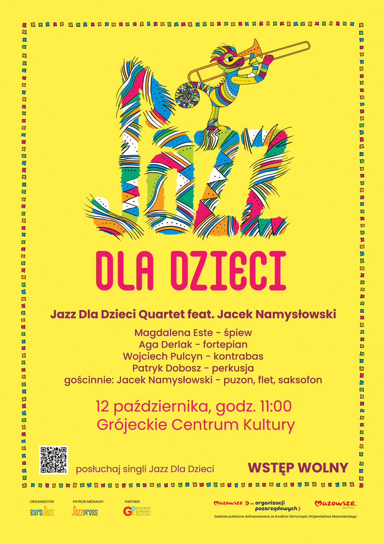 Zapraszamy na wyjątkowy koncert „Jazz Dla Dzieci” – wydarzenie o charakterze familijnym, adresowanym do dzieci w wieku przedszkolnym (i nie tylko!). Założeniem przedsięwzięcia jest popularyzacja muzyki jazzowej, edukacja kulturalna, zwłaszcza młodego pokolenia melomanów oraz pokazanie, że „jazz nie gryzie”.