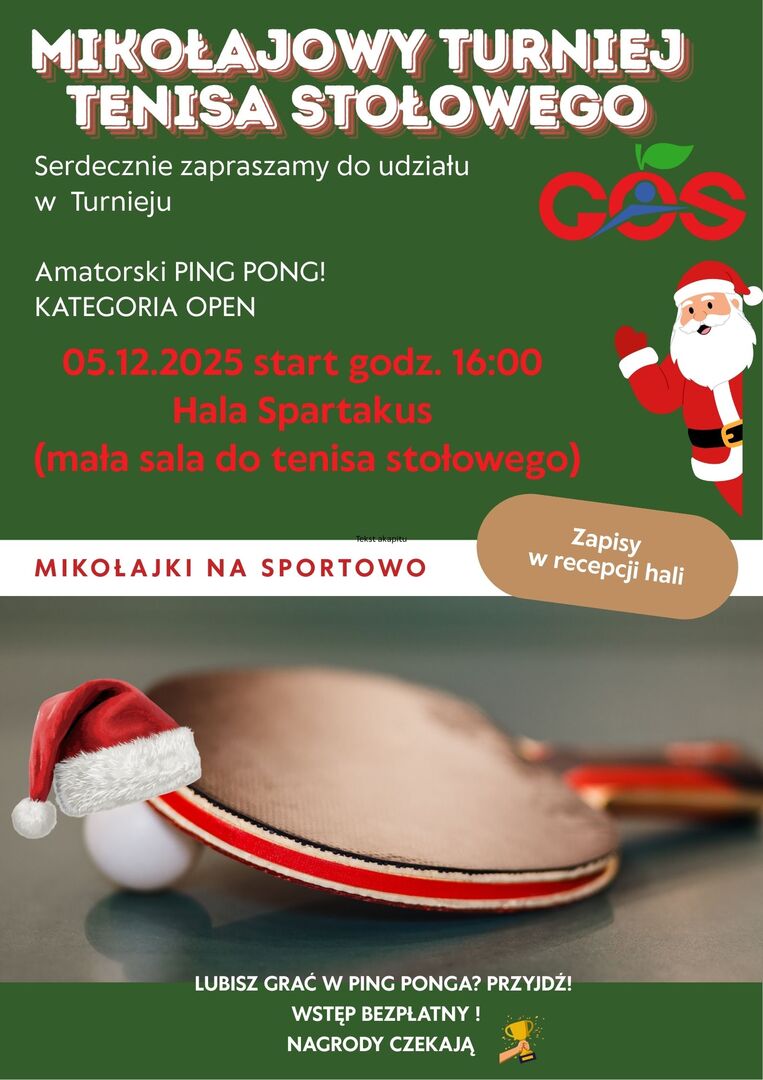 Serdecznie zapraszamy do udziału w Mikołajkowym Turnieju Tenisa stołowego Amatorskiego!