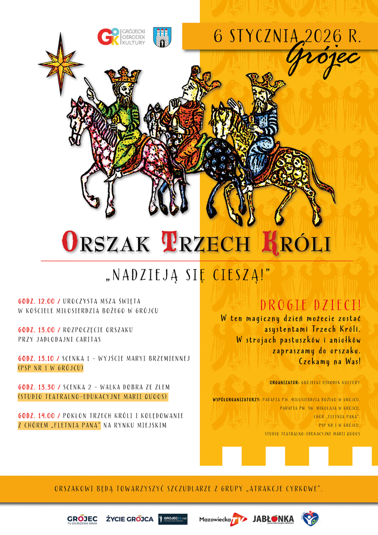 Orszak Trzech Króli Kiedy: 06.01.2026 od 12:00 do 14:30 Kategoria: Uroczystości Tematyka: KULTURA Tematyka: SPOŁECZEŃSTWO Lokalne Religijne Impreza darmowa Impreza dla rodziców z dziećmi Impreza plenerowa Impreza otwarta Lokalizacja: Plac Wolności, Grójec, grójecki, Grójec Kopiuj link Facebook.com X.com Zobacz również Zobacz wszystkie 17.12.2025 Inne Świąteczna zbiórka krwi w Urzędzie Gminy 20.12.2025 Spotkania KULTURA Spotkanie Klubu Mangi i Anime w Bibliotece 21.12.2025 Inne SPOŁECZEŃSTWO Choinki dla Kobylina 2025