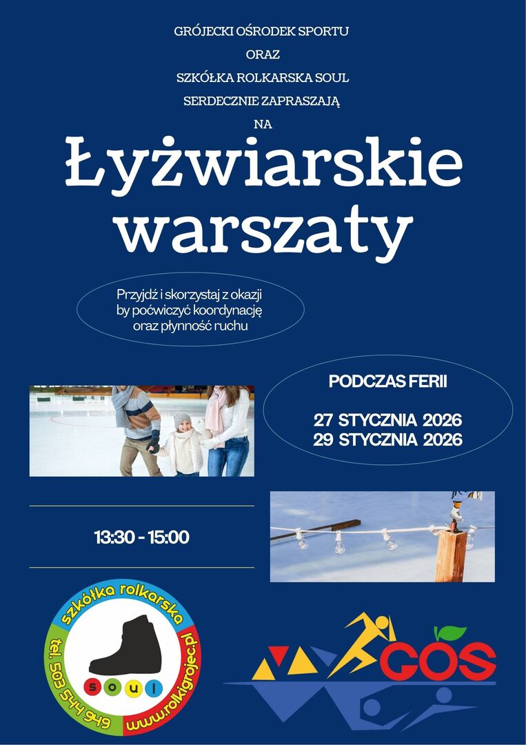Warsztaty łyżwiarskie na lodowisku Kiedy: 29.01.2026 od 13:30 do 15:00 Kategoria: Sport Tematyka: SPORT Sporty zimowe Impreza darmowa Impreza plenerowa Lokalizacja: ul. Laskowa 17, Grójec , Grójec, grójecki, Lodowisko Kopiuj link Facebook.com X.com Mapa Zobacz również Zobacz wszystkie 24.01.2026 Koncerty KULTURA SPOŁECZEŃSTWO Transmisja koncertu Andre Rieu "Wesołych Świąt" 27.01.2026 Sport SPORT Warsztaty łyżwiarskie na lodowisku 27.01.2026 Spotkania KULTURA SPOŁECZEŃSTWO Świetlica Miejska dla Kobiet